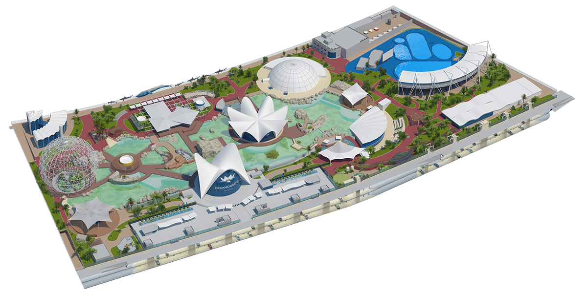También es muy interesante consultar el plano del parque interactivo de la web del Oceanografic donde al pinchar en cada parte del plano os lleva a una página explicativa del mismo.